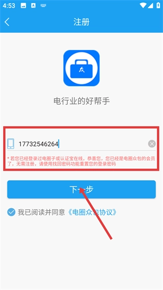 4、在注册页面填写好相关信息,勾选同意《电圈众包协议》后,点击“下一步”按钮继续账号注册流程。