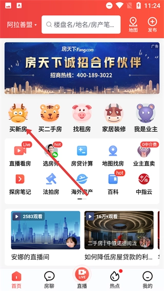 1、在房天下首页,点击【买新房】选项,进入新房页面后,就能查看区域楼盘的行情以及在售新房的列表信息。