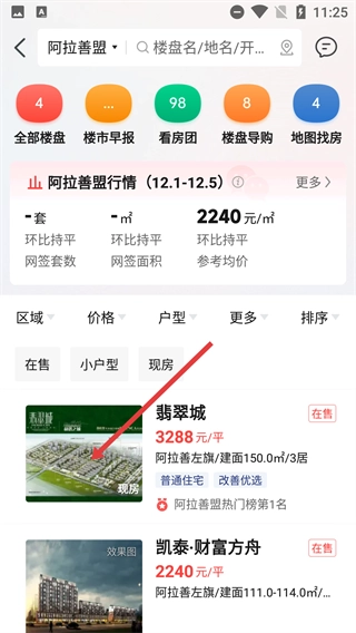 2、在新房页面中,点击【翡翠城】楼盘条目(参考均价3288元/平),即可进入该楼盘的详情信息页面。