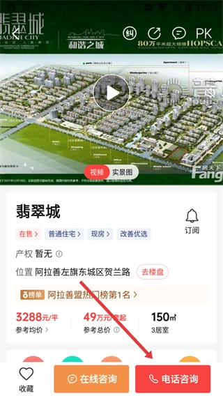 3、进入【翡翠城】详情页面,浏览完楼盘相关信息后,点击【电话咨询】按钮,此时会弹出一个包含咨询号码的拨打电话窗口。