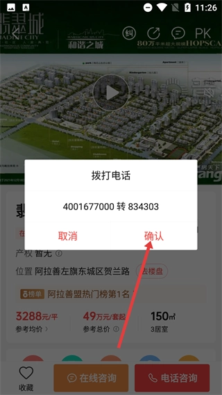 4、在拨打电话的弹窗里,先确认号码为【4001677000-转-834303】,接着点击【确认】按钮就能发起对该楼盘的电话咨询。
