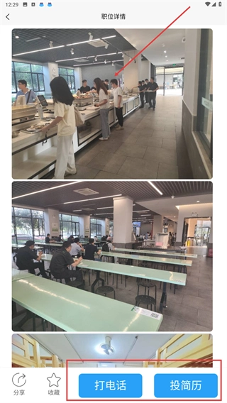 4、若您对岗位有意向,可点击【打电话】按钮直接与招聘方取得联系,也可以点击【投简历】提交求职资料,还能通过查看图片来了解工作环境。