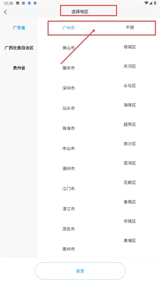 1、在地区选择界面,先选择省份(例如广东省),接着选择对应的城市(例如广州市),还能进一步选择具体区域(例如不限),以此完成地区筛选。