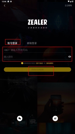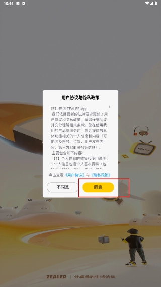 1、打开ZEALER应用,仔细阅读《用户协议与隐私政策》,点击“同意”按钮,即可进入账号登录页面。