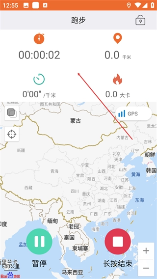 3、跑步开始后,页面会显示【00:00:02】的运动时长、【0.0-千米】的运动距离等数据,借助【GPS】定位功能,还可以点击【暂停】按钮来临时中断当前的跑步运动。