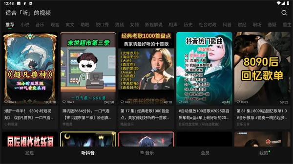 3、接着,在听抖音里可以体验到短视频、小说、音乐等多种功能。