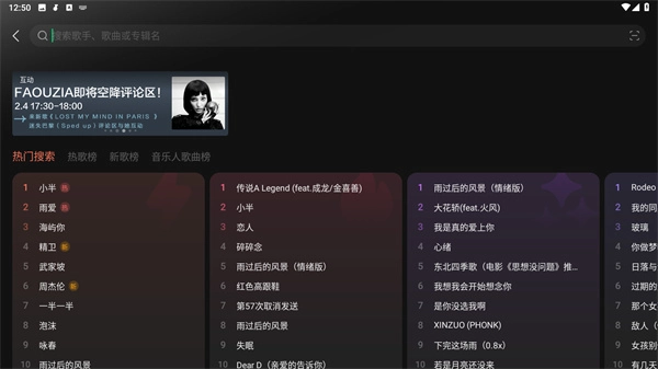 4、随后点击右上角的搜索按钮,即可查找心仪内容,同时还会推荐近期热门歌曲、热门搜索等内容。