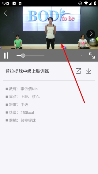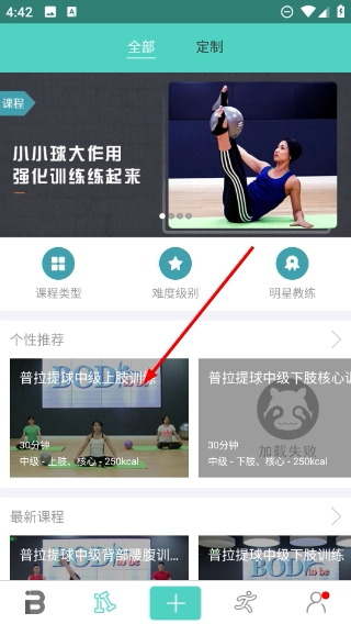 2、在课程页面的个性推荐区域,挑选目标课程(例如【普拉提球中级上肢训练】),然后进入课程详情页面。