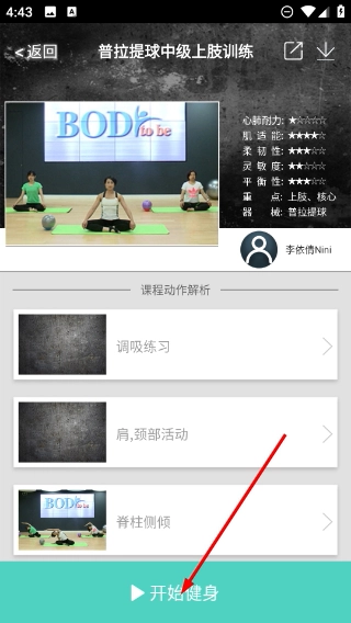 3、进入课程详情页面后,点击页面底部的【开始健身】按钮,即可启动该普拉提训练课程的播放。