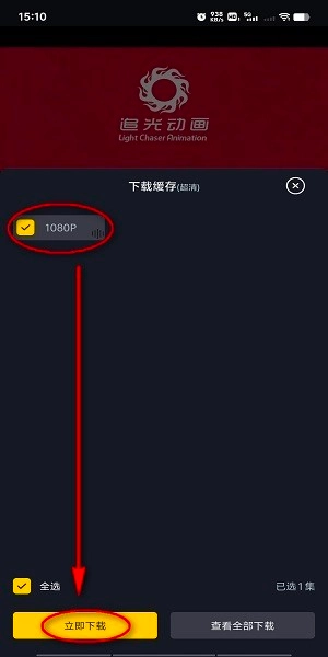 在弹出的“缓存”界面中,先选择画质(例如1080P),再点击底部的“立即”按钮。
