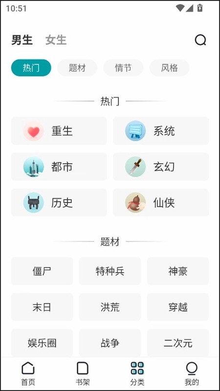 3、在分类页面,用户可依据性别频道进行划分,挑选自己感兴趣的主题类型,从而实现精准的阅读定位。