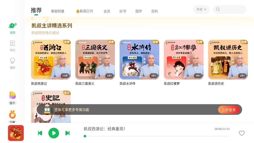 ①凯叔打造的四大名著系列——《凯叔西游记》《凯叔三国演义》《凯叔水浒传》《凯叔红楼梦》,在保留原著核心精髓的基础上,针对孩子的认知特点进行绿色改编,助力文化经典的传承与延续。