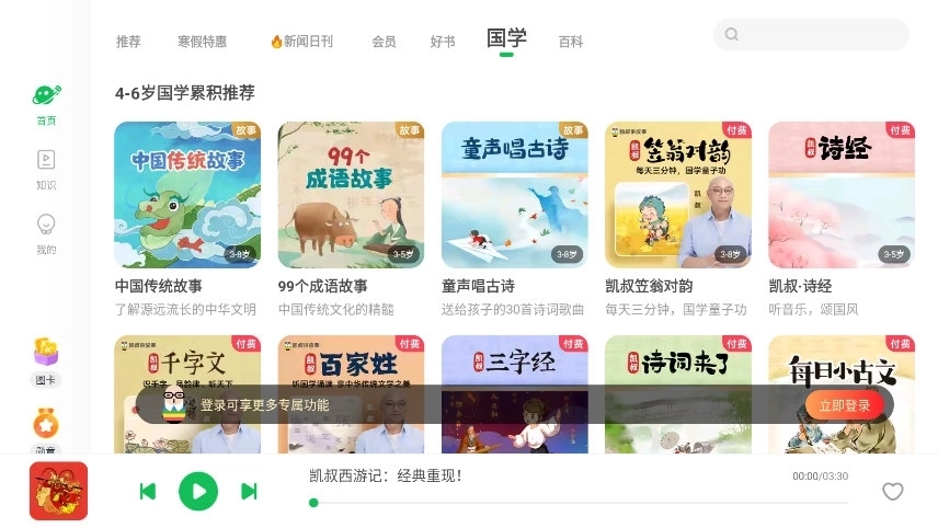 ②凯叔国学推出《凯叔声律启蒙》《凯叔三字经》《凯叔诗词来了》《凯叔论语》等多部国学精品,以贴合孩子认知的方式精心打磨内容,通过经典浸润滋养孩子言行,帮助他们培养良好语感,筑牢国学基础。