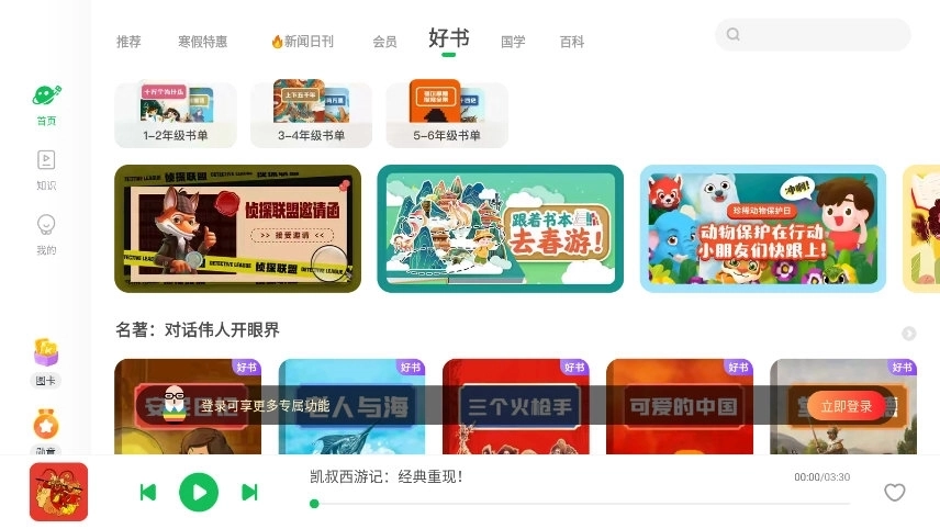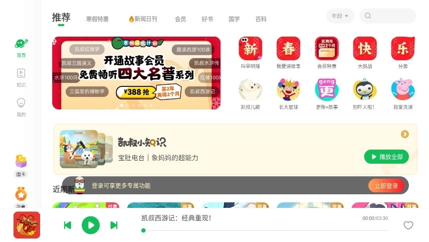 凯叔讲故事HD是一款专门为平板电脑设计的学龄前教育应用,它凭借丰富的儿童故事资源,涵盖了儿童认知、亲子教育以及儿童早教等多个领域。这款拥有高清品质的应用,为0到12岁的孩子带来了多方面的听觉享受。通过将国学、经典文学与原创故事相结合,凯叔讲故事HD构建了一个在娱乐中学习的环境。由著名配音艺术家凯叔亲自创办,它已经获得了众多家庭的信赖,不仅陪伴孩子们愉快地成长,还激发了他们的语言表达能力、思维能力、审美情趣和社交技能。