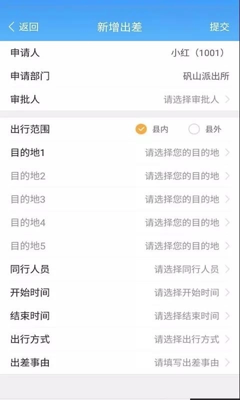 2、支持人员外出在线上报,填写相关信息后即可提交出差申请。