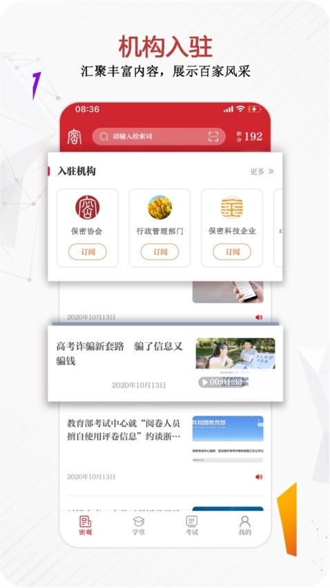 包含众多影像视频,生动直观地讲解各类保密知识、常识,帮助领导干部和涉密人员增强保密意识,提高保密工作技能。