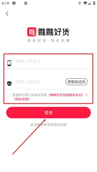 2、进入登录界面后,先在【请输入手机号】栏填写信息,接着点击【获取验证码】,再将收到的验证码填入【请输入验证码】栏,最后点击【登录】按钮,即可完成账号登录操作。