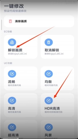 2、进入修改界面后,找到并选择“解锁画质”功能,接着可以按照自己的偏好来调整画面的清晰度,这里提供了流畅、高清、均衡等多种模式供选择。
