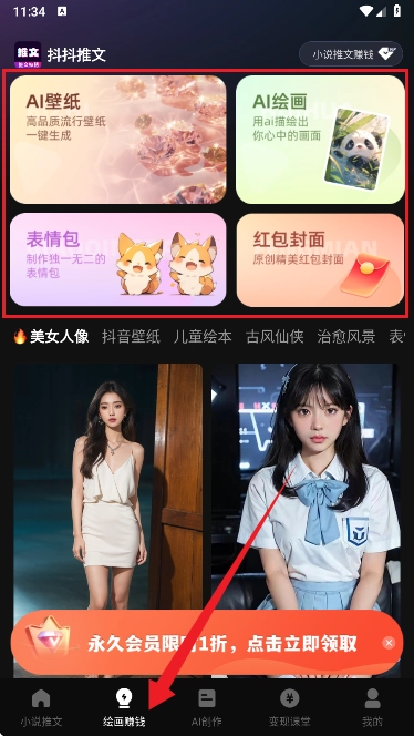 4、稍等片刻软件就会自动生成内容。此外,软件还具备绘画赚钱的功能,如图中展示的那样,这里支持AI壁纸制作、表情包制作、红包封面制作等多种创作类型。