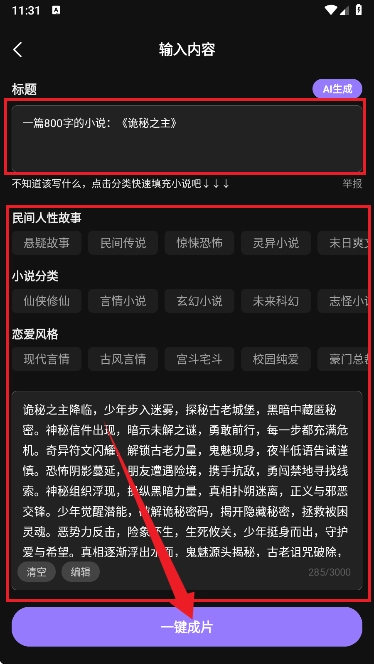 3、挑选一项功能进入,比如【小说推文】,点击后进入到如图所示的界面,接着输入标题和故事类型,再点击底部的【一键成片】按钮。