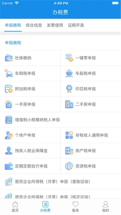 5、办税服务:用户登录系统后,能够进入办税页面,从中挑选自己需要的办税服务项目,像申报缴费、发票使用这类常见服务都包含在内。