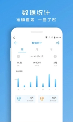 5、喝水提醒助手能让每天坚持喝水的打卡记录清晰呈现,各项数据一目了然。