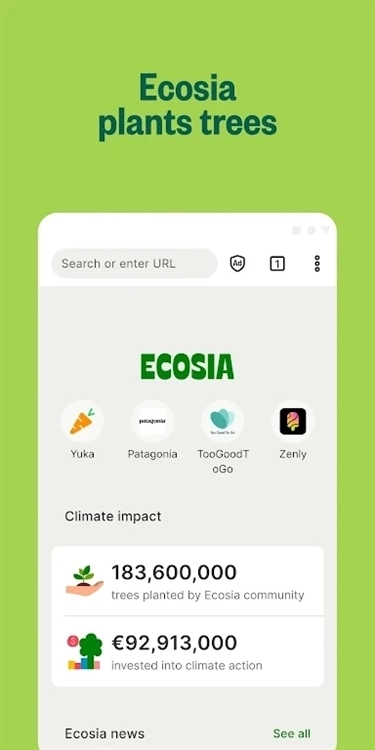 Ecosia浏览器生态应用程序基于铬开发,能为您带来直观、快捷且安全的浏览体验,涵盖了您所需的各类功能,像选项卡、隐身模式、书签以及广告拦截器等。此外,我们会在您的环保结果旁显示一片绿叶,助力您在进行搜索时做出更具环保意识的选择。