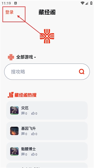 1、在藏经阁主界面点击左上角的【登录】按钮,即可进入账号创建流程;此界面包含攻略类相关内容,需完成登录后才能使用这些功能。