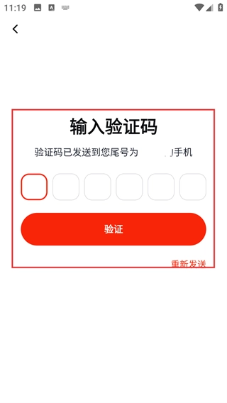3、进入【输入验证码】页面,在输入框中填写收到的验证码,点击【验证】按钮完成号码校验,若超时可选择【重新发送】验证码。