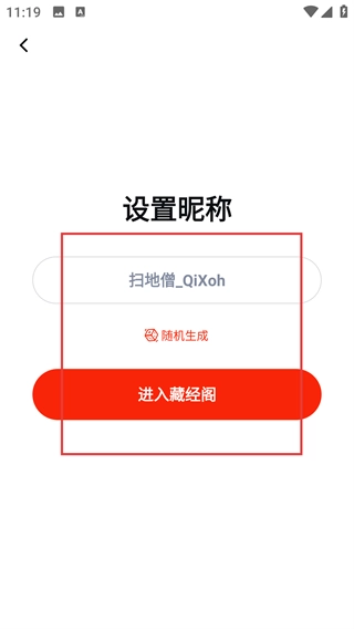 4、进入【设置昵称】页面后,你可以选择使用系统随机生成的昵称,也可以自行输入自定义昵称;完成昵称设置后,点击【进入藏经阁】按钮,就能完成注册流程并进入主界面。