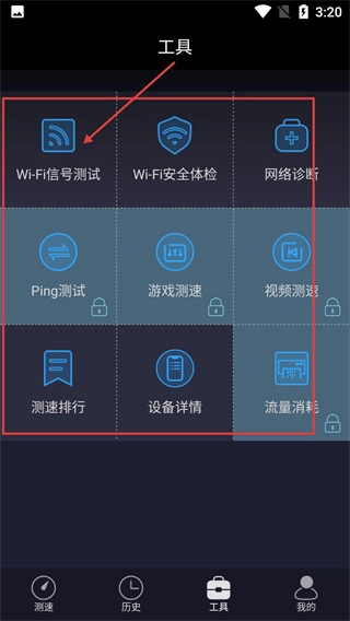 2、进入工具页面后,可看到【Wi-Fi信号测试】【Wi-Fi安全体检】等功能选项,这些工具可辅助检测网络状态与设备信息。