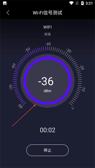 4、测试启动后,页面会显示当前Wi-Fi信号强度(单位为dBm)及测试时长,可点击【停止】按钮结束测试,信号数值越低代表强度越强。