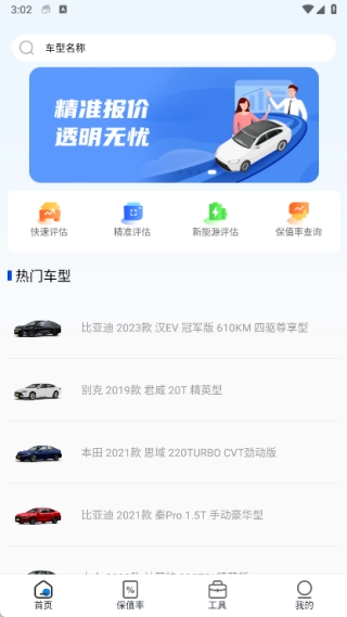 1、首页整合了快速评估、精准评估、新能源评估、保值率查询等实用功能,用户可便捷使用这些工具,也能在此了解当下热门车型。