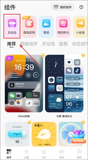 1、打开colorfulwidget应用后,在首页的顶部位置点击【灵动岛】选项