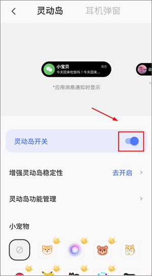 4、进入【灵动岛】的设置页面后,用户向下滑动屏幕,就能为【灵动岛】添加宠物,还可以调整它的位置。