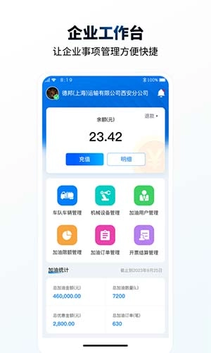 e能加油企业版整合了传统油站、撬装站等油站资源,专门针对物流企业车辆、工程项目机械、农机面临的加油贵、加油难等问题提供解决方案。企业管理人员通过e能加油能够实现车队车辆管理、机械设备管理、加油用户管理、加油限额管理等功能,让企业事务管理变得轻松便捷,财务管理更加高效,不再有开票对账的烦恼。企业的加油用户使用e能加油可以享受到更优惠的加油服务,还能体验足不出户、送油上门的便利。