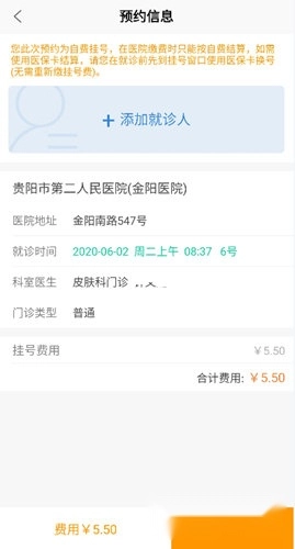 4、点击【添加就诊人】选项,依次填写就诊人的相关信息,最后完成挂号费用的缴纳即可。