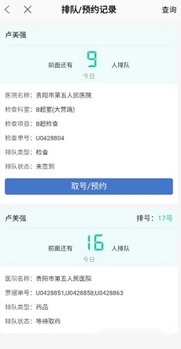 2、能够看到医院名称、检查科室、检查项目、排队人数等信息,点击【取号/预约】按钮。
