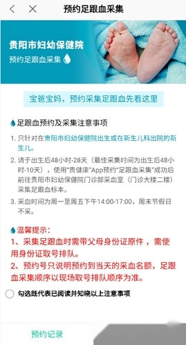 1、进入贵健康首页,点击【足跟血预约】功能。