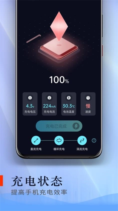 电池爱护卫士这款软件能帮助用户更好地保护电池,操作十分简单。充电完成后,界面会显示充电已完成,提醒用户及时拔下电源。此外,它还能全面检测和分析电池的用电情况,让用户可以用更科学的方式使用电池。