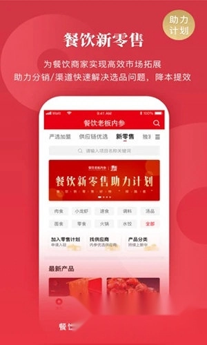 5、餐饮老板内参应用设有新零售计划板块,该板块支持各类零售商品的售卖,用户可申请入驻。