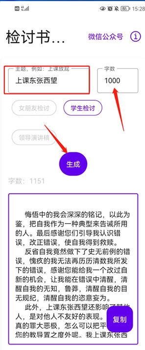 用户可以通过关键词描述主题,获取更细致的检讨书,无论字数是三百字还是数千字都能生成,不仅能得到原创内容,还支持文案自动保存。