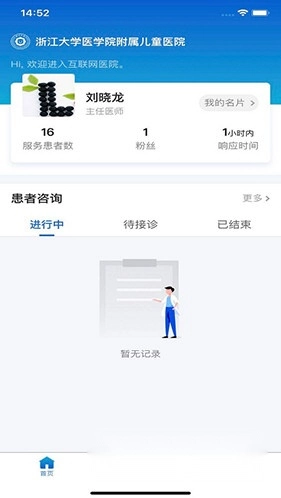 2、进入首页后,可查看名片信息、工作数据以及分类展示的患者资讯记录。