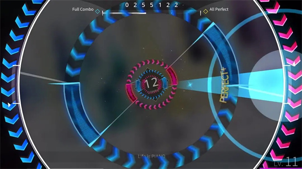 4、音符会不断飞来并随着背景音乐节奏变化,玩家需要通过控制圆环的位置和旋转方向来收集音符。