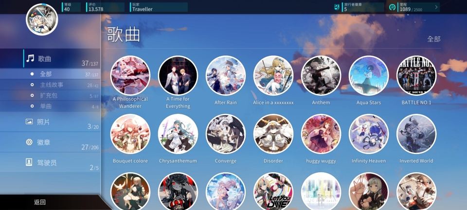 歌曲:查看游戏中已获得/所有歌曲徽章,截止到1.10.0版本,该分类共有120项