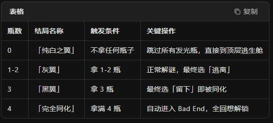 探索房间 → 寻找机关/钥匙 → 选择是否拿瓶 → 状态变化 → 解锁新区域 → 最终逃脱 or 同化。