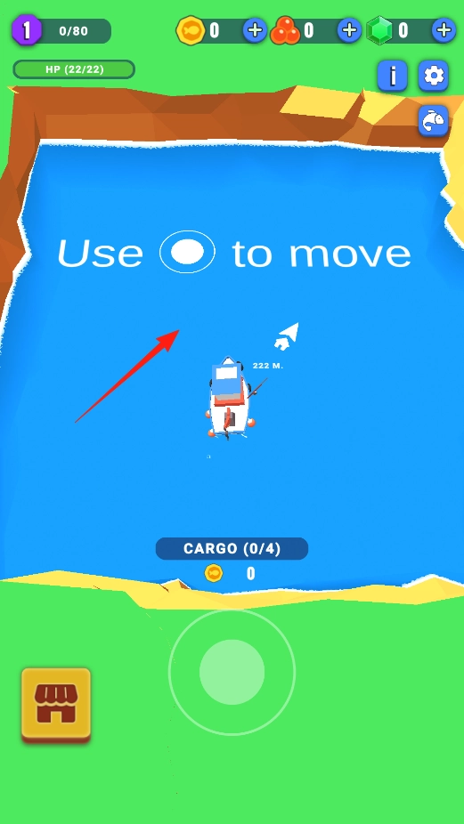 1. 按照提示滑动虚拟摇杆,借此操控小船在水面上移动,于水域中展开探索,寻觅鱼类,为后续捕鱼做好准备,同时感受移动操控的机制。