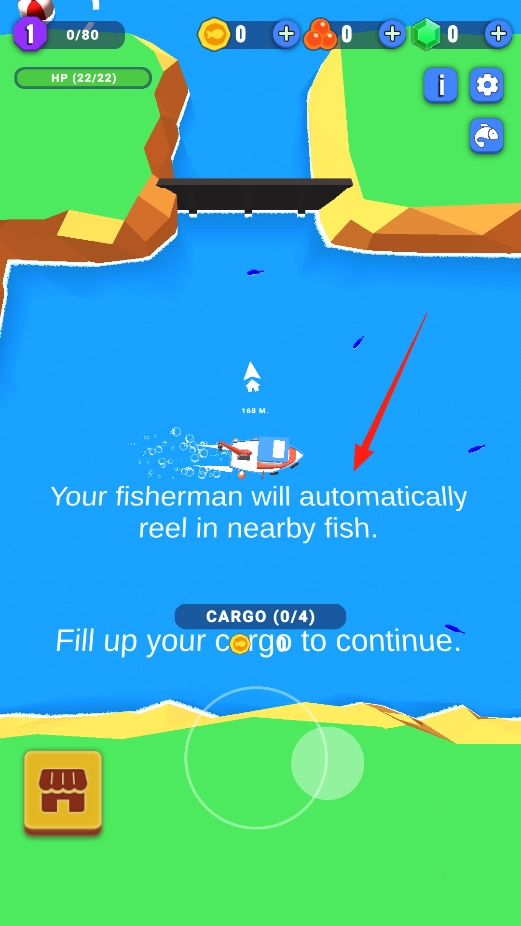 2、驾驶小船靠近鱼群,渔民自动收线捕鱼,积累货物,填满cargo后推进流程,体验自动捕鱼玩法。