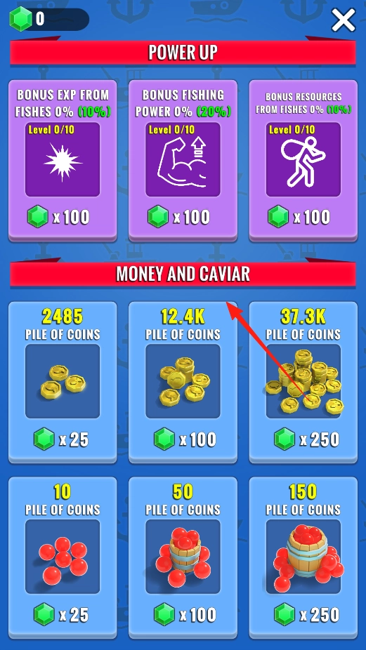 3、进入升级界面选择金币堆或能力提升项,消耗绿宝石兑换,强化捕鱼收益或能力,进一步享受游戏,体验资源升级机制。