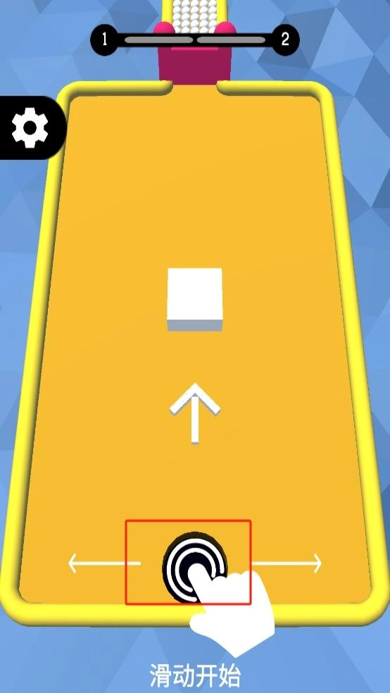 1、点击底部黑色圆形操控键,左右滑动调整方向,对准路径推动白色方块,使其顺利通过黄色区域